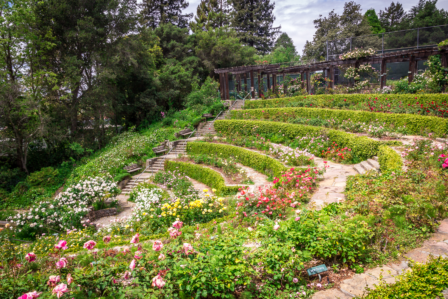 The Berkeley Rose Garden Berkeley California. In addition to more than 3 acres of roses the garden also has a redwood pergola 4 tennis courts picnic area hiking trails foot bridges a semi-circular terraced amphitheater and an ornamental pool fed by Codornices Creek which runs through the garden. Work commenced in 1933 and was completed in 1937.